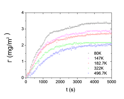 Adsorbed amounts on alumina of five different PS-PEO copolymers as a function of time for 0.01 mg/mL bulk solution concentration in toluene. Each curve refers to the kinetics of a different copolymer that is noted in the inset.