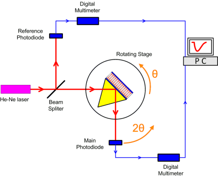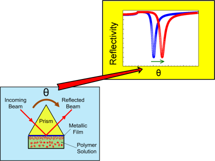 όπου ε1 είναι η μιγαδική διηλεκτρική σταθερά του μετάλλου, ε2 η διηλεκτρική σταθερά του μέσου που περιβάλλει το μέταλλο και c η ταχύτητα του φωτός στο κενό. Τα επιφανειακά πλασμόνια μπορούν να διεγερθούν από το φως στη λεγόμενη διαμόρφωση Kretschmann χρησιμοποιώντας ένα πρίσμα επικαλυμμένο με μέταλλο. Σε αυτήν την περίπτωση, τα εξαφανιζόμενα κύματα που παράγονται από την ολική εσωτερική ανάκλαση του p-πολωμένου φωτός στην επικαλυμμένη επιφάνεια του πρίσματος συνδέονται με τα επιφανειακά φορτία και όταν η προβολή του κυματοδιανύσματος τους παράλληλα με την επιφάνεια του πρίσματος kx πληροί την παραπάνω σχέση διασποράς, τα επιφανειακά φορτία ταλαντώνονται συλλογικά με συχνότητα ω. Για ένα επιφανειακό πλασμόνιο σε μια λεπτή μεταλλική μεμβράνη, η σχέση μεταξύ συχνότητας και μήκους κύματος του κύματος δεν επηρεάζεται μόνο από τη διηλεκτρική σταθερά και το πάχος της μεταλλικής μεμβράνης, αλλά εξαρτάται επίσης έντονα από τις διηλεκτρικές σταθερές των υλικών κοντά στην επιφάνεια της μεμβράνης. Αυτά τα γεγονότα καθιστούν τη φασματοσκοπία SPR ένα πολύ ευαίσθητο εργαλείο για μελέτες επιφανειών, όπως η προσρόφηση μορίων σε μια μεταλλική επιφάνεια. Από πειραματική άποψη, η ρύθμιση της συνιστώσας kx του εξαφανιζόμενου κυματοδηγού επιτυγχάνεται με την περιστροφή του πρίσματος με μεταλλική επικάλυψη σε γωνίες πρόσπτωσης πάνω από την κρίσιμη γωνία για ολική εσωτερική ανάκλαση.Για μια συγκεκριμένη γωνία πρόσπτωσης, το kx ταιριάζει με το κυματοδιάνυσμα του επιφανειακού πλασμονίου και παρατηρείται ένα απότομο ελάχιστο στην μετρούμενη ανακλαστικότητα. Η γωνιακή μεταβολή της ανακλαστικότητας ονομάζεται «καμπύλη ανακλαστικότητας». Το πείραμα αφορά την παρακολούθηση των τροποποιήσεων (μετατόπιση και διεύρυνση) στην καμπύλη ανακλαστικότητας λόγω των αλλαγών στο διηλεκτρικό περιβάλλον του μετάλλου εάν η προσρόφηση μορίων λαμβάνει χώρα στην ελεύθερη επιφάνεια της μεταλλικής μεμβράνης.